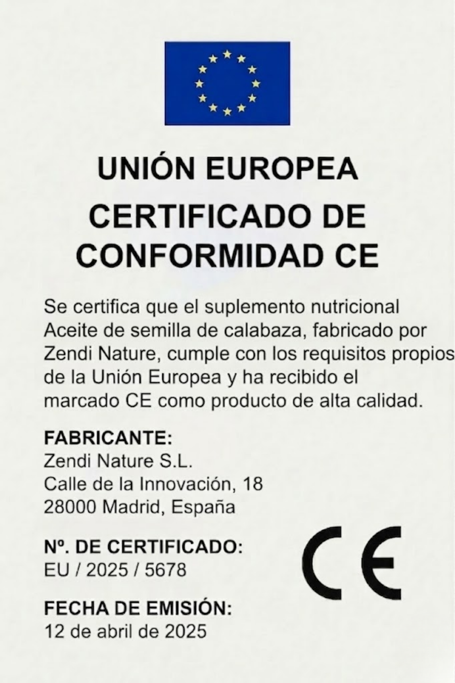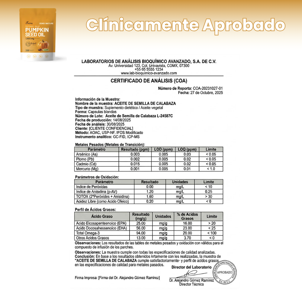 El Aceite de Calabaza de VIVONU por Zendi Nature está elaborado bajo estrictos estándares de calidad y seguridad, cumpliendo con todas las normativas de salud para suplementos naturales. Cada cápsula es cuidadosamente producida para garantizar pureza, efectividad y confianza, ofreciéndote un producto seguro que apoya tu bienestar masculino